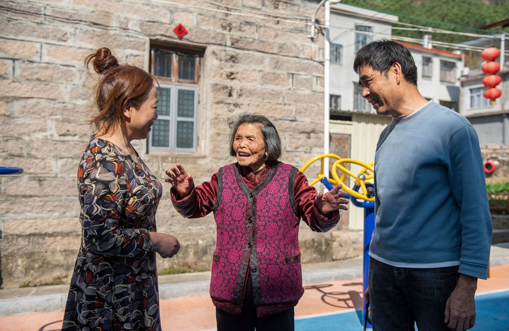 白楼自然村九十一岁的林奶奶正在健身器械上舒展筋骨,她家的老屋被翻修整改一新,门外就是宽敞的健身场地。