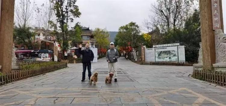 上图:与儿子带着两只小狗在大石板古村