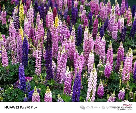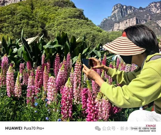 漫山盛放的鲁冰花映入眼帘,紫、粉、白、黄各色花穗亭亭而立,与红岩绝壁、青山溪流相映成趣,构成独属于八里沟的春日画卷,成为绝佳的手机摄影素材。